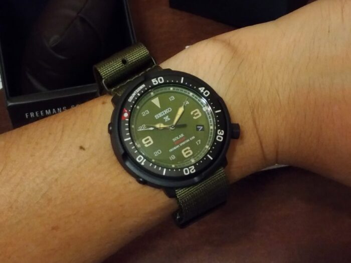 ミリタリーテイストを纏ったカラーリングとNATOストラップが良い感じ。