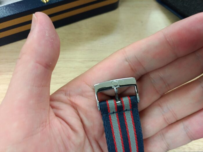 NATOストラップの尾錠にもオメガマーク。