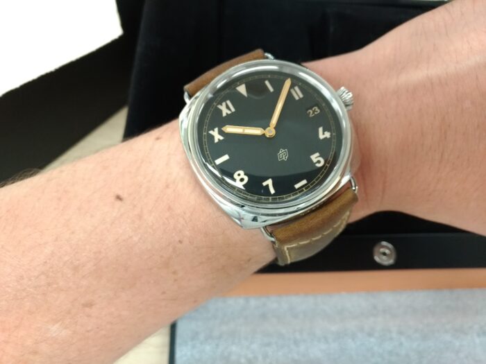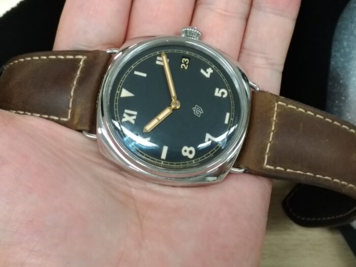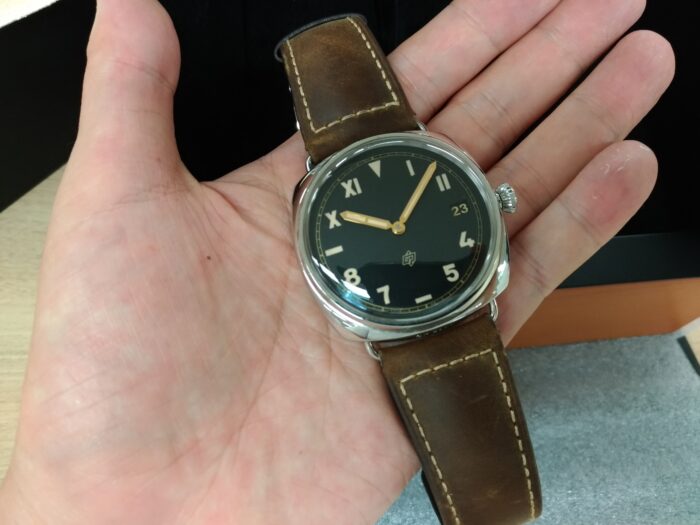 47mmとケースサイズは大きいんですが、パネライルミノール44mm経験者なら「あれ?そんなに大きくないね」と思うはずです。