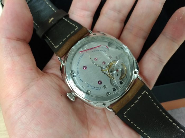 独特なユニークダイヤルを搭載した47mmのラジオミールに手巻きキャリバー P.3000(自社製3日巻)が採用されシースルーバックから覗くことができます。