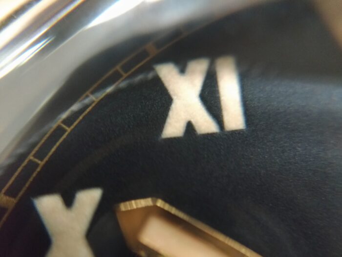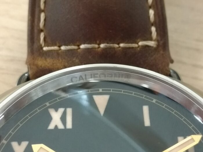 「ラジオミール カリフォルニア スリーデイズ」の文字盤は、初代ラジオミールに採用されていたデザインを忠実に再現し、アワーインデックス、アラビア数字とローマ数字が交互に配されています。<PANERAI HPより>