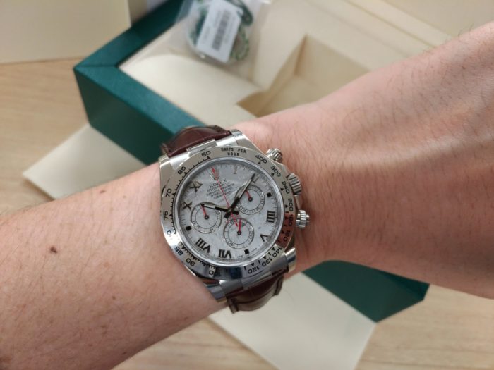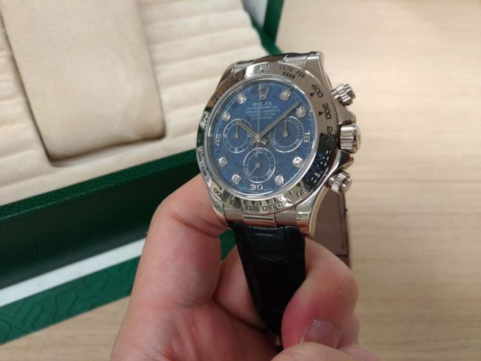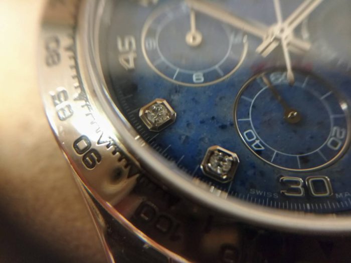 ホワイトゴールドのデイトナにしか使用されない特別な稀少石を使用した文字盤ですね。