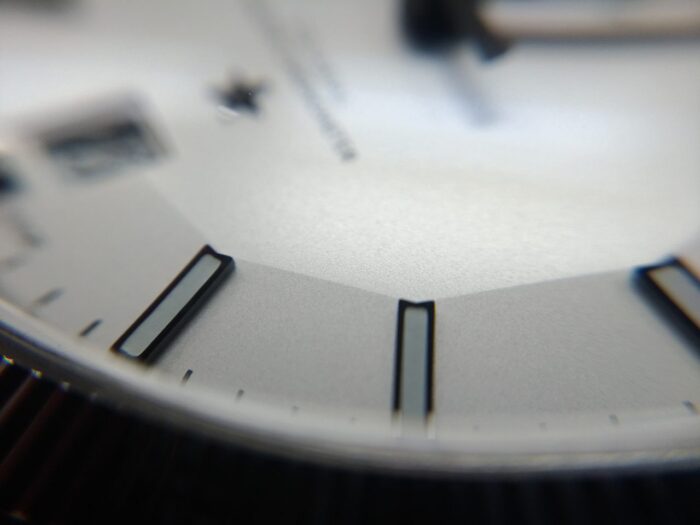 シンプルなバーインデックスにパイパンダイアル(パイ皿モチーフの段ありダイアル)、そしてCラインのケース形状。