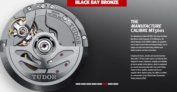製造のブラックベイブロンズモデルを駆動キャリバーのMT5601は33.8ミリメートル、すべてのTUDORのキャリバーの最も広い直径を測定します。その透かし彫りのローターはサンドブラスト仕上げでサテンブラッシングされています、そしてそのブリッジとプレートは交互に磨かれたサンドブラスト表面とレーザー装飾を持っています。