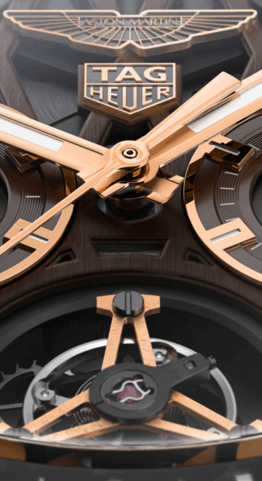 タグ・ホイヤー カレラ クロノメーターの特別限定エディション。ハイエンドなホイヤー02T COSCモデル。ダイヤルにローズゴールドプレートのアストンマーティンのロゴ入りで、このモデル専用に開発された限定レイアウトを採用しています。 また、リューズもこのトゥールビヨン専用で、同じくアストンマーティンのレイアウトを採用しています。