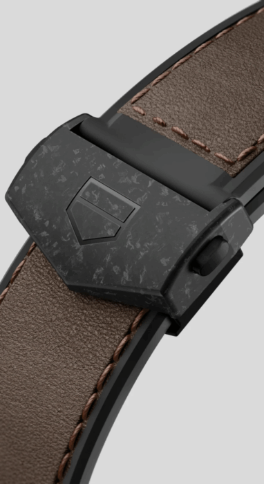 ブラックPVDコーティングが施されたグレード2チタン&カーボン製ケースおよびカーボン製固定式タキメーターベゼルは、軽量でラグジュアリー感があり、堅牢な作りになっています。 インデックス、カウンター、針を含むディテールの大半に、ローズゴールドプレートが施されています。