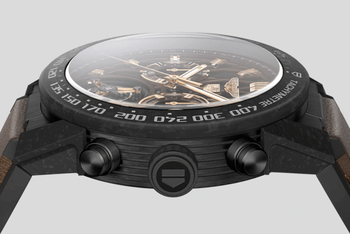 この45mm COSC認定トゥールビヨン クロノメーターは、ブラウンダイヤルにローズゴールドのアクセントを効かせた「アストンマーティン×タグ・ホイヤー カレラ」の限定モデルです。 ストラップは、モーターレーシングファンに嬉しい、アストンマーティンと同じカーフレザーを使った同系色ブラウン。 ケースバックにはアストンマーティンの特製エングレービングと「One of 150」の文字が刻印されています。<TAG HEUER HPより>