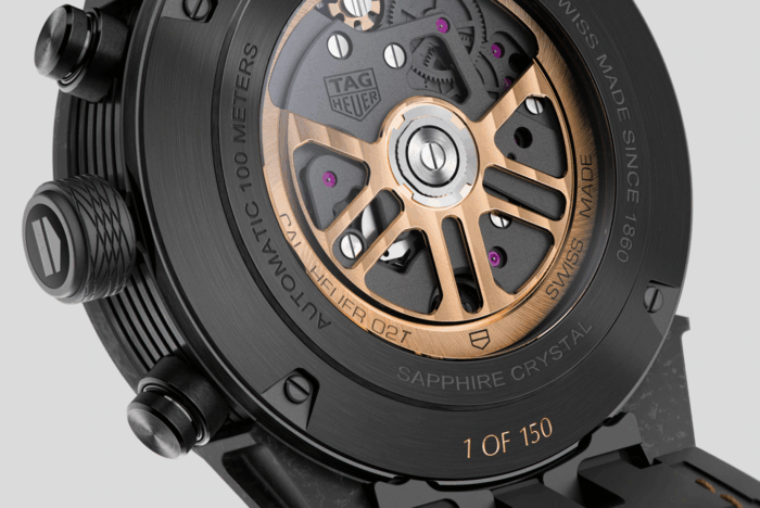 ブラックPVDチタンおよびサファイア製ケースバックには、150本の限定モデルの1本であることを示すシリアル番号とアストンマーティン限定エディションの刻印が施されています。