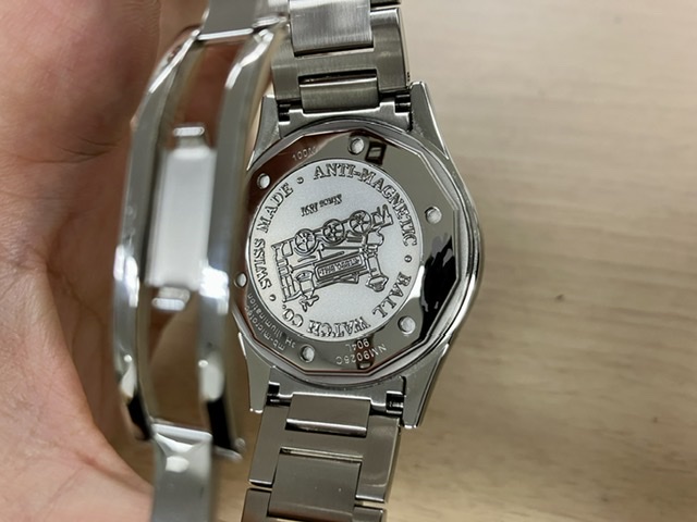裏蓋には蒸気機関車のレリーフ。
