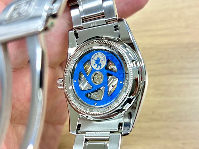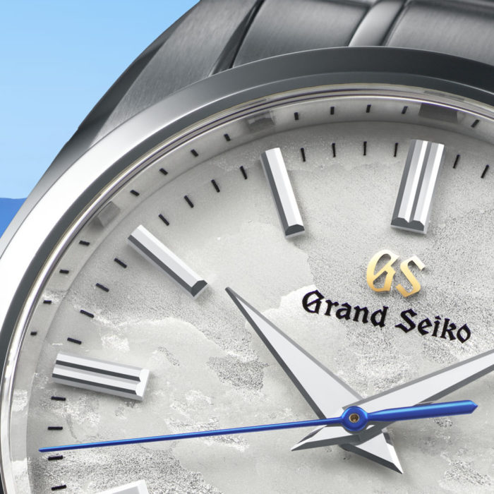 キャリバー9S を生み出す製造地「グランドセイコースタジオ 雫石」からほど近い、岩手山の山頂から見上げる中天の情景を、どこまでも広がる空のようなスカイブルーのダイヤルで表現。さらに、シースルーの裏ぶたからは陽極酸化処理によって施された、ブランドの象徴であるグランドセイコーブルーの回転錘を見ることができます。