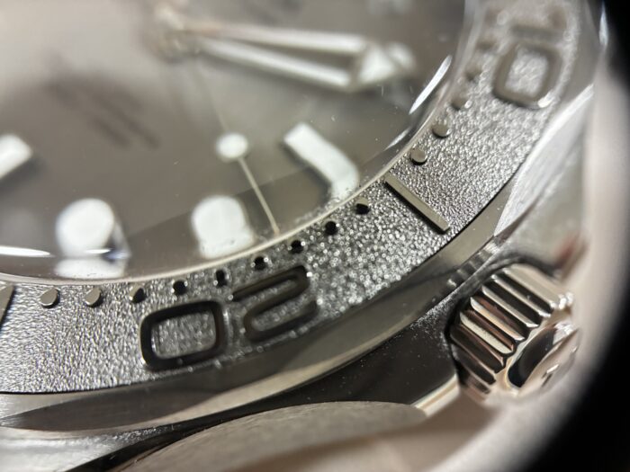 007スタイル(ボンド映画60周年記念モデル)の210.30.42.20.03.002もシュウ酸アルマイト処理を施したブルーのアルミニウム製ダイアルでした。1995年の映画『007/ゴールデンアイ』でジェームズ・ボンドが身に着けた「シーマスター ダイバー300M」にインスピレーションを得たモデルだったからです。