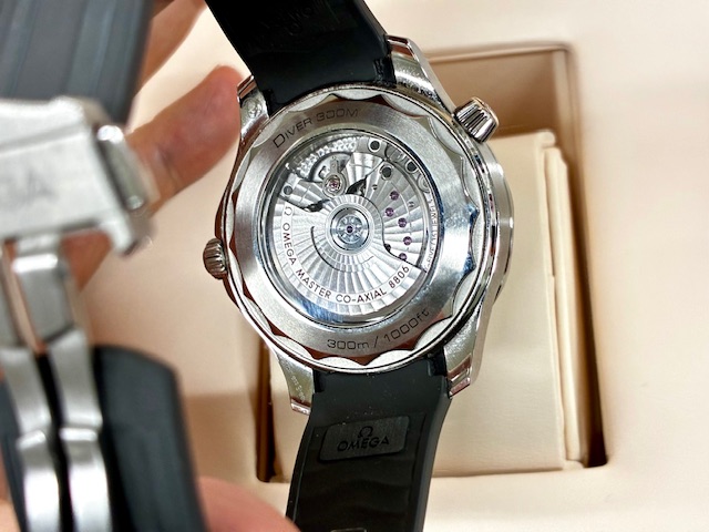 合わせられているのは、クラスプが付いたメッシュブレスレットです。オメガ コーアクシャル マスター クロノメーター キャリバー 8806搭載。サファイアクリスタルガラスのケースバックからその姿を眺めることができます。