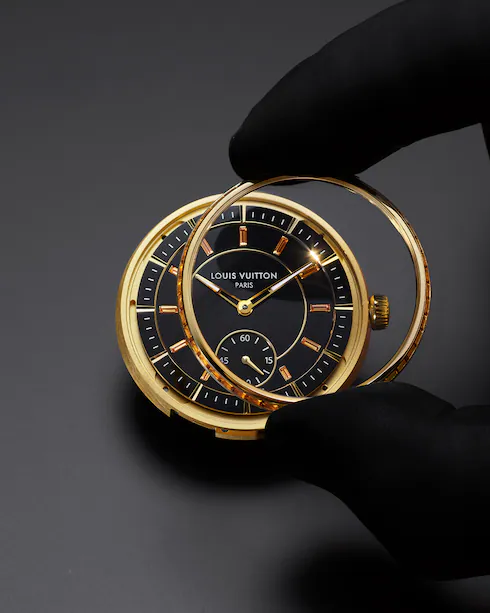 宝石のセッティングと石のカッティングの見事なショーケースである「ラ・ファブリーク・デュ・タン ルイ・ヴィトン」は、ヴィンテージ風の 18K イエローゴールド製タンブールにオニキスの文字盤とサフラン色のサファイアを添えて、時計をさらにグレードアップしました。調和のとれた素材の組み合わせにより、輝くゴールドのシルエットとブラックオニキスの深く反射する魅力が対照をなしています。
