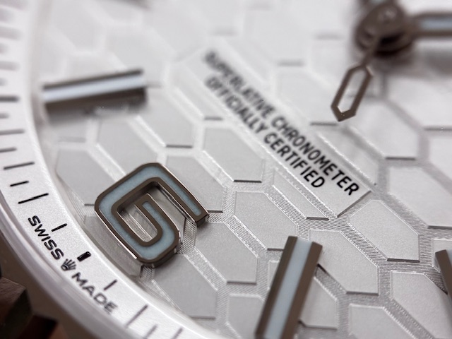このダイアルは、サテン仕上げが施されたハニカムモチーフがあしらわれている。このダイアルの製造には自社内で有する伝統的な職人技とハイテク技法を要した。