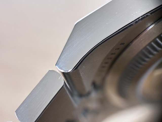 さらに、ブレスレットのサイドリンクの上端とミドルケースの上端は面取りされており、ポリッシュ仕上げが施されたその面は、ひとつながりの光のリボンのように見える。そして、コンシールドタイプのクラウンクラスプを備えている。
