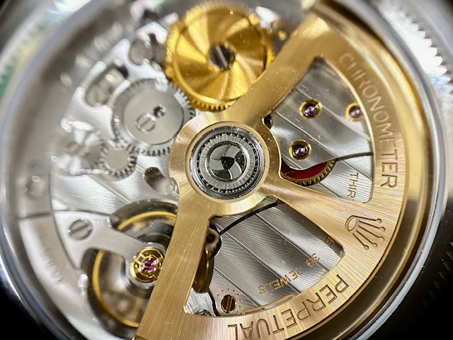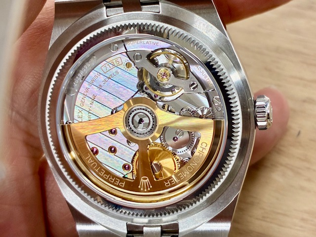 見慣れてきましたが、ランドドゥエラーもロレックスでは数少ないシースルーバック(トランスパレントケースバック)です。