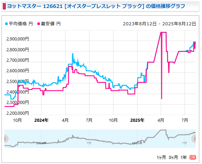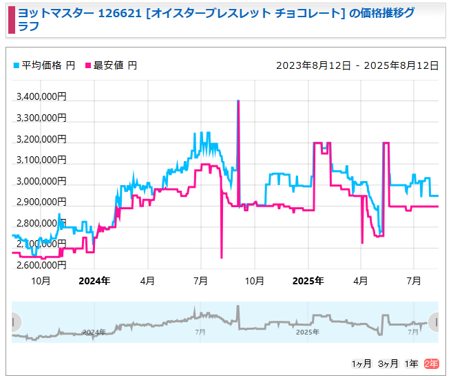 一方、126621(ロレゾール)はインテンスブラックが大きく値を上げ、特に4月には300万円超えを記録。現在はやや落ち着いていますが、それでも高水準を維持しています。チョコレート文字盤は安定しており、価格改定後の定価を考えると中古の掘り出し物感があります。