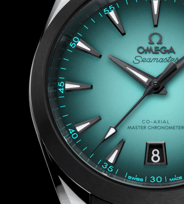 海をインスピレーションにした魅惑的な色彩を奏でるラッカー仕上げのターコイズダイアルには、ブラックのグラデーションが施され、面取りされた針とインデックスはグレーのPVD加工とホワイトのスーパールミノヴァで仕上げられています。同じくグレーのPVD加工が施されたオメガのロゴと日付窓がグレーの転写文字とマッチし、外周のターコイズカラーのミニッツトラックとハーモニーを奏でています。