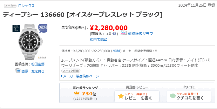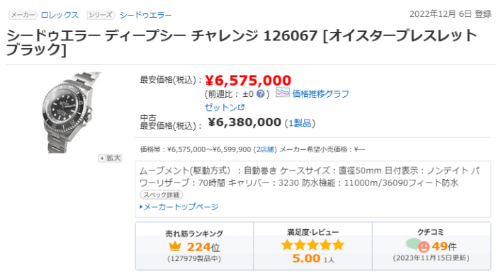 ディープシーチャレンジは定価もバカ高いですが、プレミアム価格で750万円なんて言う驚愕のプライスがセカンドマーケットでは展開されていました。価格ドットコムにはタイミング的に掲載がありませんでしたね。