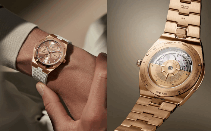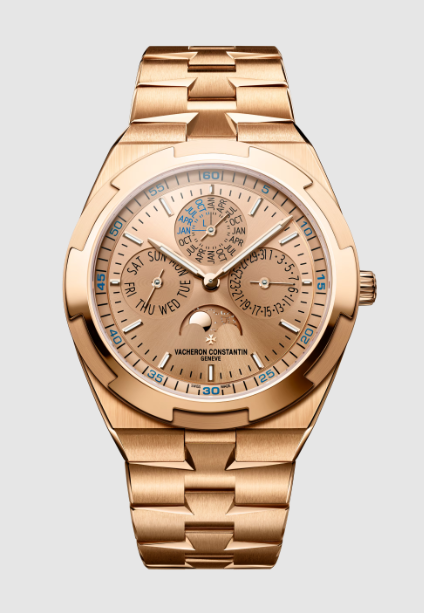 この18K(5N)ピンクゴールドの「オーヴァーシーズ・エクストラフラット・パーペチュアルカレンダー」は高級時計の複雑機構とスポーティな美しさをエレガントに融合されています。2100年まで正確な日付を表示できる厚さわずか8.10mmの極薄のパーペチュアルカレンダーは、星が散りばめられた夜空と2つの金色の月が描かれたムーンフェイズによってその存在感が際立ちます。2種類のラバーと18K(5N)ピンクゴールドの3種類のインターチェンジャブルストラップが付属され、時計をパーソナライズすることができます。ブレスレットのリンクには、ヴァシュロン・コンスタンタンの象徴であるマルタ十字がさりげなく象られています。