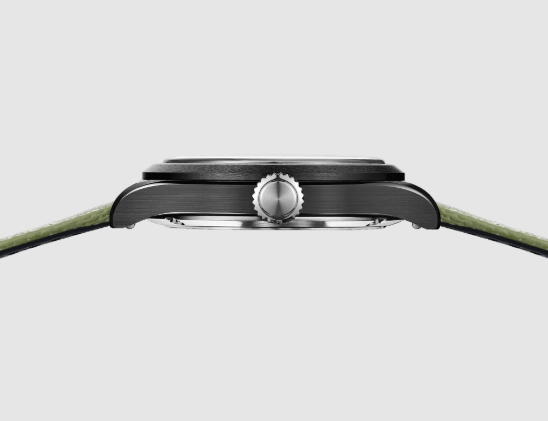 マットブラックセラミックにケースされたシルエットは、耐久性と精度を追求したクラシックなフィールドウォッチの堅牢な実用性を彷彿とさせます。曇り空のアルプスを彷彿とさせる文字盤は、視認性が低いという美学を体現し、控えめながらも確かな存在感を放ちます。ヴィンテージスタイルの夜光塗料が、嵐の中の灯台のように道を照らします。