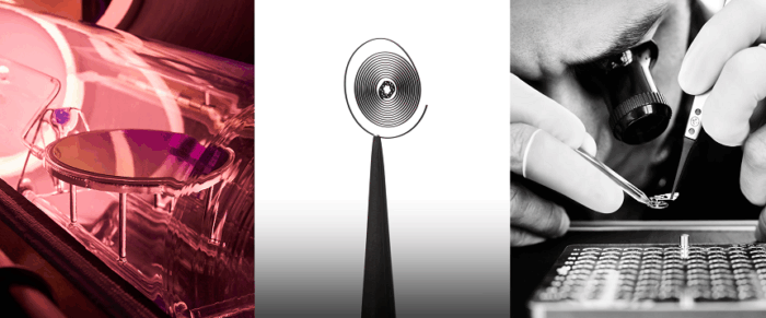 最後に、それぞれのカーボン製ヒゲゼンマイが、ゴールドインサートが施され特別に設計されたアルミニウム製テンプに細心の注意を払って取り付けられます。こうして、長期にわたる優れた安定性と耐環境性を実現する温度補償システムが構築されます。