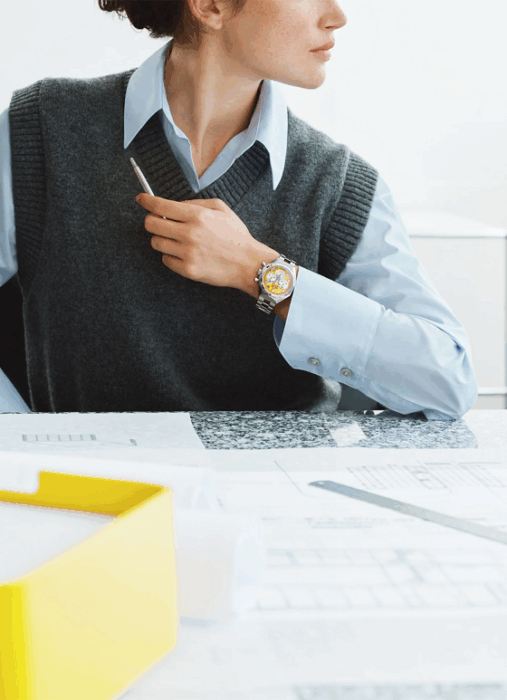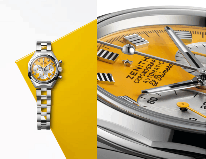 スポーツシックなクロノグラフは、「もし1969年のデファイに、世界初の高振動自動巻クロノグラフである革命的なエル・プリメロが搭載されていたら?」という問いへの答えとなります。また、同時代を象徴するもうひとつのデザインアイコン、USMハラーシステムからインスピレーションを得ています。八角形のケースと「ラダー」ブレスレットにはステンレススチールを採用。USM ゴールデンイエローの文字盤には、植字によるスクエアのアワーマーカーが配されています。