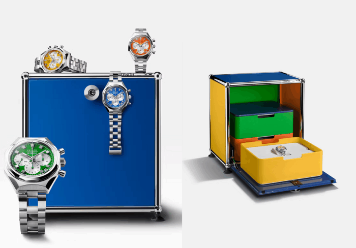 ゼニスとUSMモジュラーファニチャーによる限定カプセルコレクションは、このコラボレーションのために製作されたカスタムデザインのUSMハラー タイムピースチェストと共に発売されます。鮮やかな4色のバリエーションはそれぞれ60本限定のリミテッド エディション。4種の「デファイ クロノグラフ USM」をコレクションし、同じくカラフルなボックスに収めれば、USMハラーシステムが謳うモジュラーの美学とUSMのシグネチャーカラーを堪能できます。