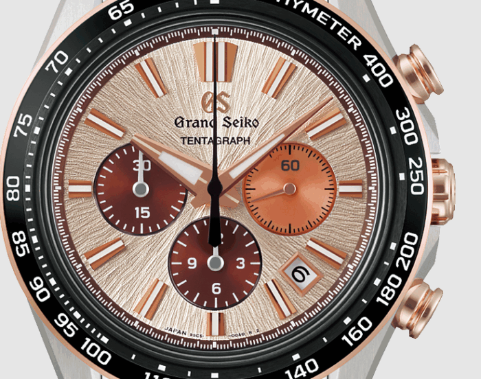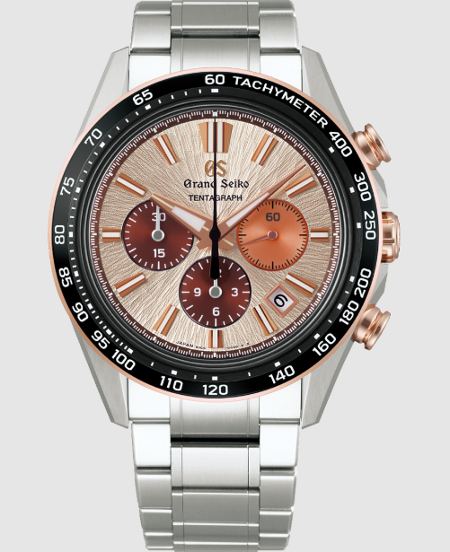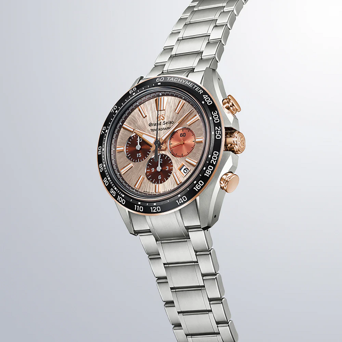 グランドセイコーの真髄と日本の美意識を高い次元で融合させた独自のデザイン文法「エボリューション9スタイル」をベースにしたメカニカルクロノグラフ。グランドセイコーの機械式時計の製造元「グランドセイコースタジオ 雫石」から望む、岩手山から着想を得た型打ち模様を採用し、カッパーピンクを基調とするカラーリングで朝の陽光に輝く堂々たる姿を表現しました。