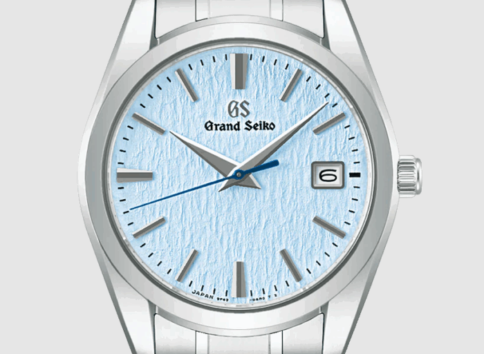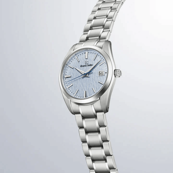 風紋が刻まれた雪のような独特なダイヤル模様は、信州の山々に積もった雪から着想を得たものです。この繊細な質感のダイヤルに、澄んだライトブルーのカラーリングを施しました。雪原を思わせるパターンと、清らかな水色のコントラストが、腕元にさりげない個性と洗練をもたらします。グランドセイコー専用の年差クオーツムーブメント「キャリバー9F62」を搭載し、37mmサイズのケースに仕上げました。ケースとブレスレットには、ステンレススチールと比べて約30%軽量で、耐傷性・耐食性に優れるブライトチタンを採用することで、軽くて心地よい装着感を実現しました。