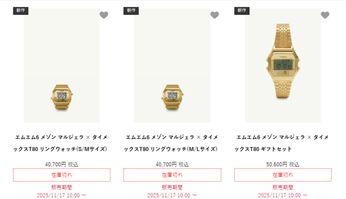 販売するのは全国のエムエム6メゾンマルジェラ ストア、メゾン マルジェラ トウキョウ、メゾン マルジェラ ヒロシマ、メゾン マルジェラ 札幌丸井今井、一部セレクトショップ、エムエム6 メゾン マルジェラ 公式オンラインストア、タイメックス 日本公式オンラインストアだそうです。
