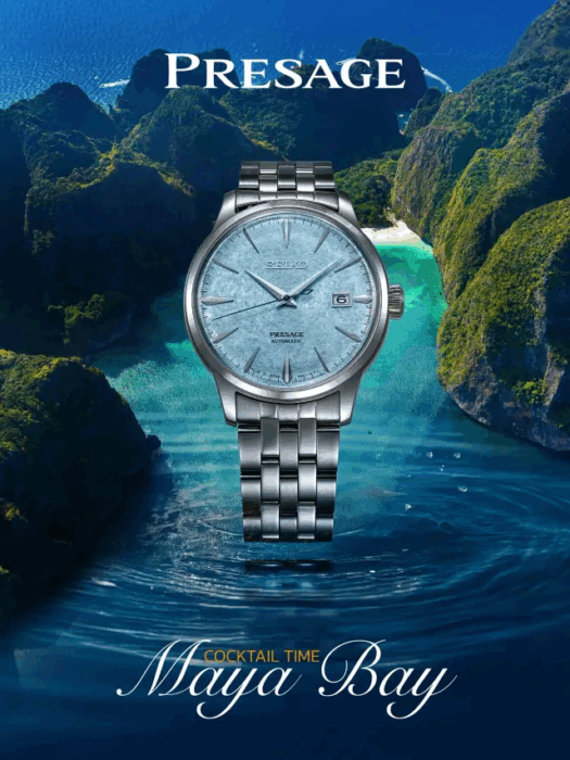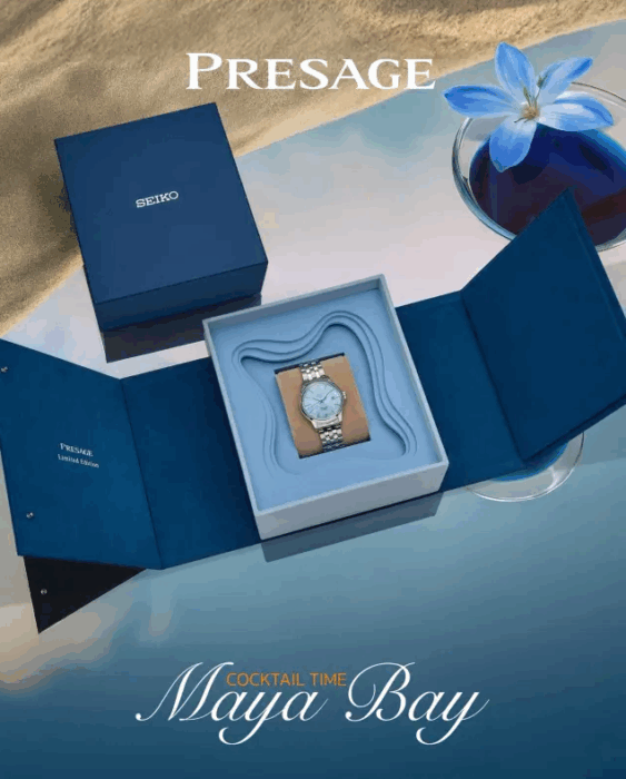 きらめく青い海を映し出す時計を通して、マヤベイの魅力を体感してください。アンダマン諸島の自然の美しさを伝える特別なカクテルグラス「マヤベイ」からインスピレーションを得た文字盤は、あらゆる角度からクリスタルのように輝きます。セイコー プレザージュ カクテルタイム マヤベイ リミテッドエディション、サイズ40.5mm、品番SRPM01J、価格22,000バーツ。セントラル支店とロビンソン支店のセイコー時計カウンター、またはセントラルオンラインストアで実物をご覧ください。