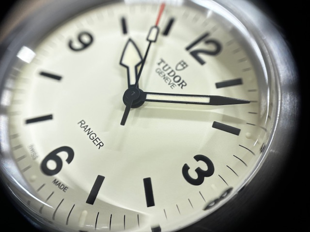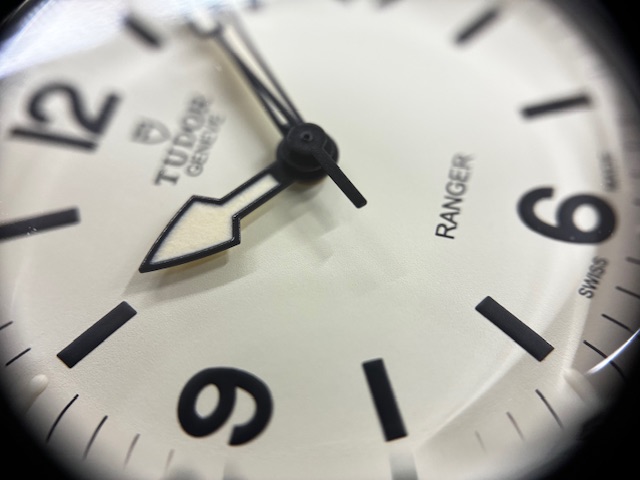 またダイアルに目を向ければ、ペイントされたアワーマーカーのように、歴史からの影響を色濃く受けているディテールに気づくだろう。ベージュまたはブラックの色調は、グレイン仕上げのマットダイアルとコントラストを成すと同時に、チューダーのロゴや文字のトーンに呼応する。時針は丸みを帯び、分針は角張ったいずれも矢印型の針もまた、レンジャーならではのデザイン。
