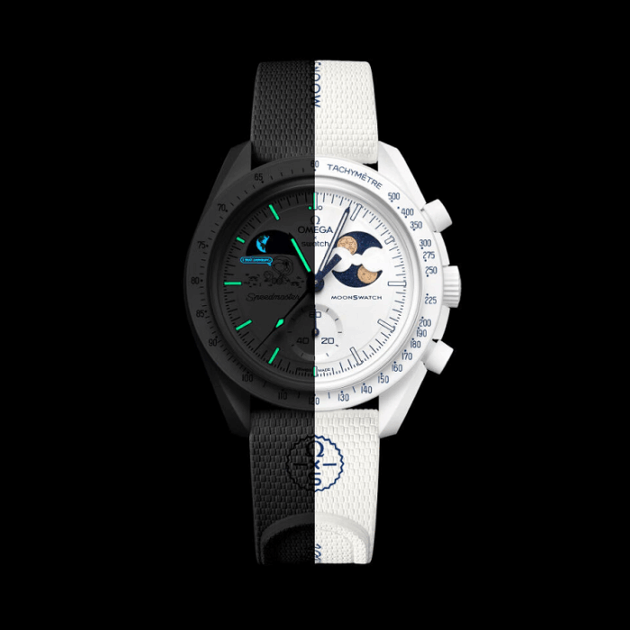 バッテリーカバーには地球にインスパイアされたデザインが施され、ホワイトのラバーストラップとVELCRO®クロージャーが宇宙飛行士風のクールな感じを添えています。このコレクションのすべての時計の文字盤には、OMEGA X Swatchの文字、アイコニックなSpeedmasterのロゴ、そしてMoonSwatchのロゴが見られます。またボックス型バイオ由来素材グラス構造、グラス中央にはSwatchのロゴを参照した「S」のエッチング加工、文字盤の外側のリングとへこんだサブダイヤルには繊細で洗練された円の模様、シャープでスムーズなラグ構造、そしてもちろんユニークなBioceramicのタッチ。これらが全モデルに共通です。アワーマーカー、時針と分針、クロノグラフ秒針の先端は、Grade A Super-LumiNova®でコーティングされ、暗闇で完璧に光ります(グリーンの発光)。