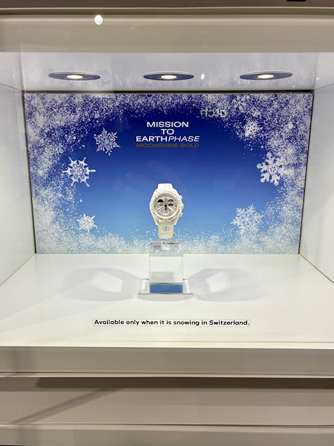MISSION TO EARTHPHASE – MOONSHINE GOLD Cold Moonは、コールドムーンの日である2025年12月5日から冬の最後の日である2026年3月20日までの期間、Bioceramic MoonSwatchコレクションを取り扱うすべてのSwatchストアで販売されます。遊び心を加え、2025年12月5日の翌日からは、このモデルはスイスで雪が降っている時のみ、世界中のSwatchストアで販売されます。