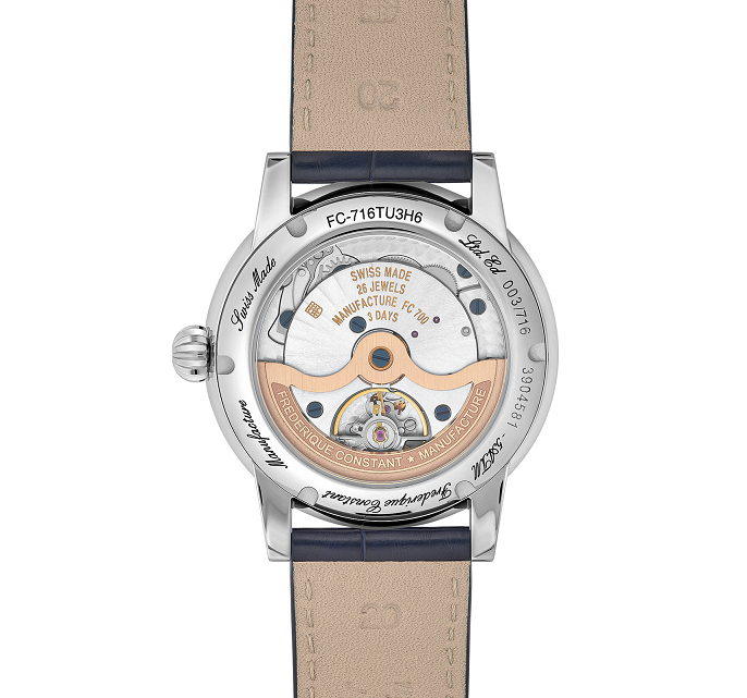 <FC-716>は2024年に発表。2015年に発表した<FC-715>のパーツの90%以上のパーツを流用しつつ、パーツ数を増やし、香箱を18%大きく、主ぜんまいを31%長くする設計変更で72時間のロングパワーリザーブを実現。ブリッジにはコートドジュネーブ装飾を施している。5年間の国際保証が付帯している。