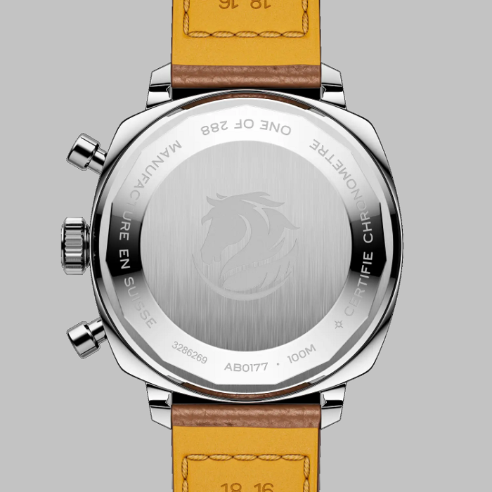 38mmのスティールケースに、自動巻きマニュファクチュール キャリバー ブライトリング01 を搭載、70時間パワーリザーブのクッション型2カウンタークロノグラフで、9時位置のスモセコには早そうな馬の絵が描かれています。