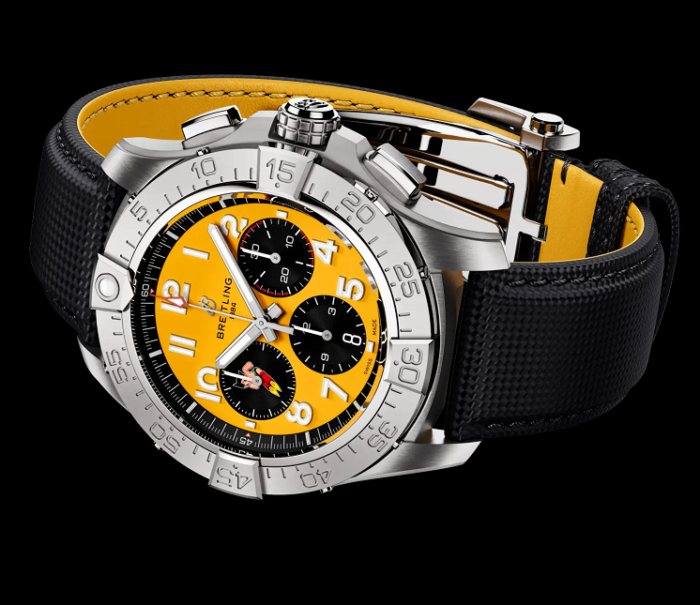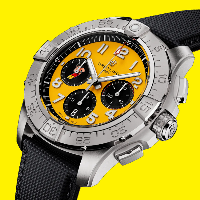 鮮やかなイエロー文字盤は、アトムのロケットブーツを想起させるエネルギッシュなカラーリング。