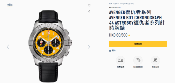 訳しますと「AB01476A1I1X1 アベンジャー B01 クロノグラフ 44 アストロボーイ 60,500香港ドル この限定版は99本限定で、中国本土、香港、マカオでのみ販売されます。」との事で、日本円で約1,205,000円 ノーマルモデルの+25万円くらいの設定となっております。