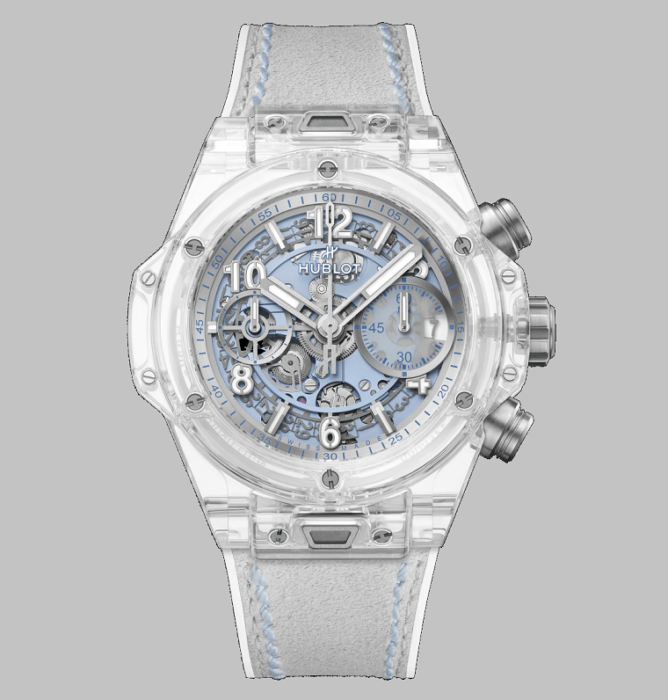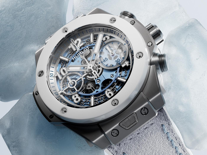 「サファイア」エディションはわずか30本限定で、サファイアクリスタルの透明な輝きを放ちます。一方、「チタニウム セラミック」エディションは200本限定で、羽のように軽いチタニウム製ケースにホワイトセラミック製ベゼルを組み合わせています。両モデルともケース径42mm、ウブロが特許を取得している「ワンクリック」システムを搭載し、鮮やかなホワイトまたはアイスブルーのカーフスキンにラバーを裏打ちした交換可能な2本のストラップが付属します。瞬時にスロープモードからナイトモードへ切り替えることができます。