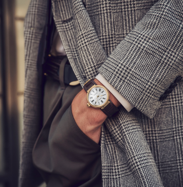 懐中時計のような雰囲気のある独特の形状とプロポーションを備えたゴールドカラーのケースは、タイムキーパーにも採用されていた琺瑯ダイヤルの、艶やかな光沢と温かみのある質感をより一層引き立てます。
