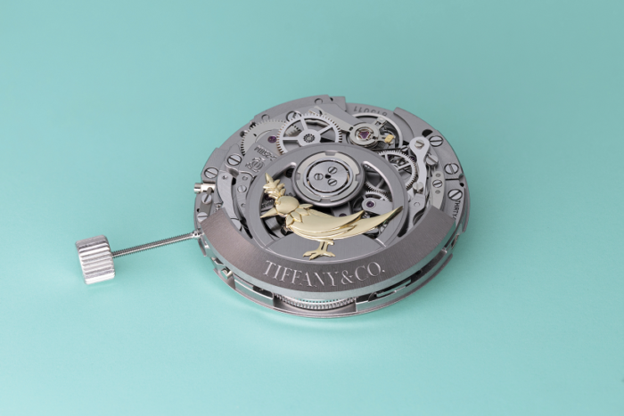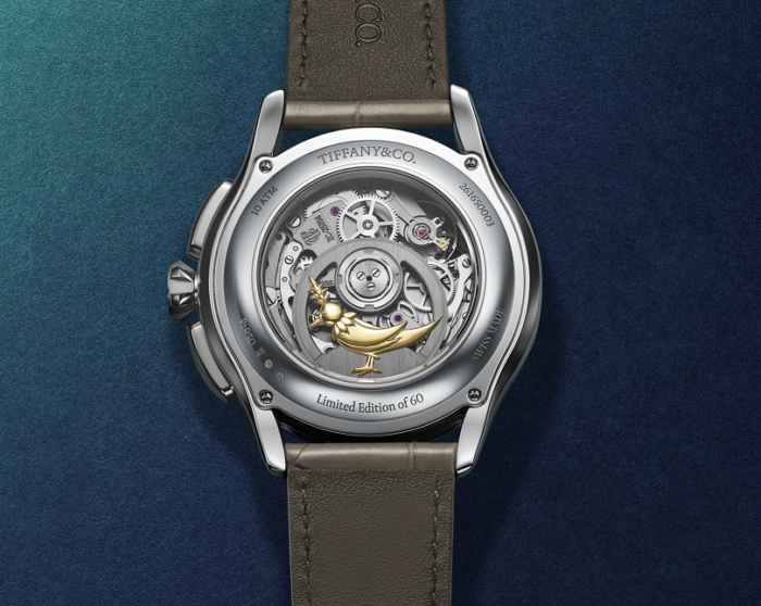 リューズはティファニーの6本爪ソリティアリングを想起させるファセット形状だったり、ジャン・シュランバージェさんがティファニーのために発表したバード オン ア ロックをローターにセットしたり、ジュエラーらしさも盛り込みながら本格派なクロノグラフを作っていますね。