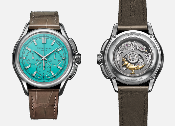 文字盤はティファニーブルーのラッカー仕上げで、バゲットカットダイヤモンドがインデックスにセッティングされ、搭載されたムーブメントは自動巻きクロノグラフ エルプリメロ400で、18金イエローゴールド製バード オン ア ロックがセットされております。