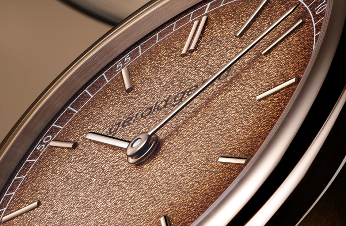 4N ローズ ゴールドで作られたクッション型のケースに収められたグレイン ダイヤルは、光と温かみのある栗色のグラデーションのくすぶる相互作用を呈し、大胆さとレトロ風の洗練さを喚起します。