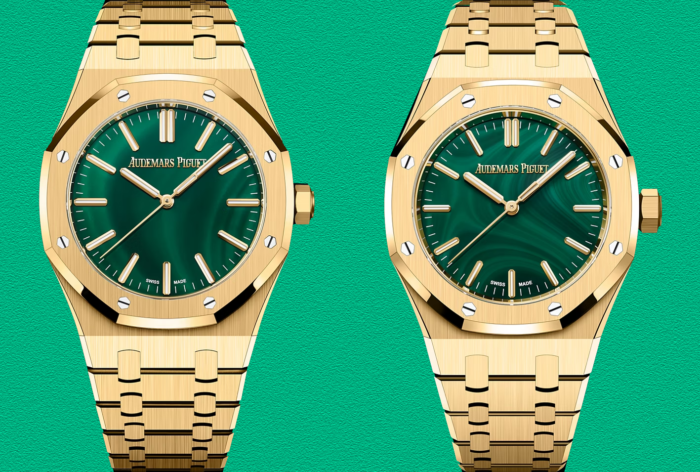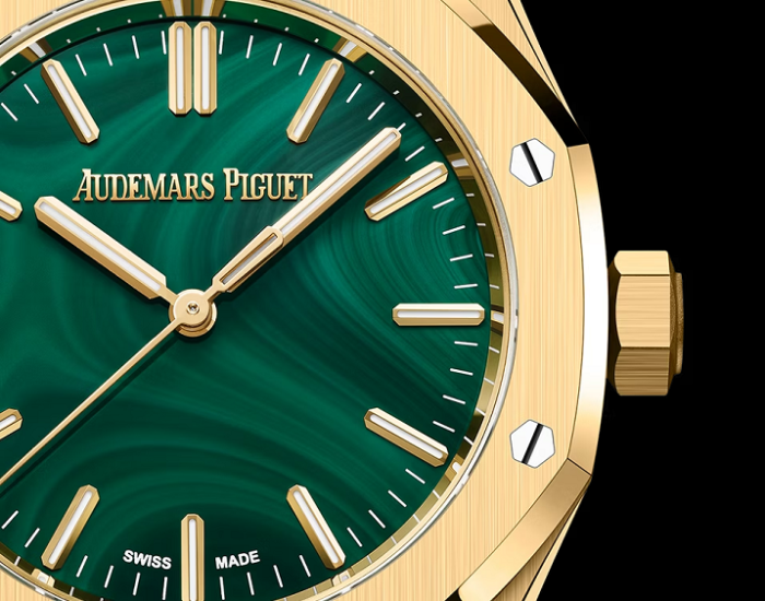 天然石ダイヤルの芸術性とエレガンスを称える、37mmの新作。18Kイエローゴールドと鮮やかなマラカイトのコンビネーションが、ロイヤル オークのアイコニックなデザインに質感と深みをもたらします。