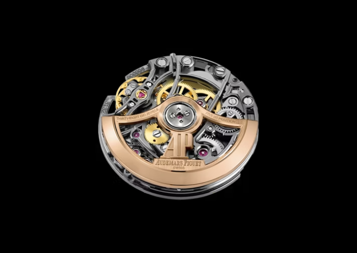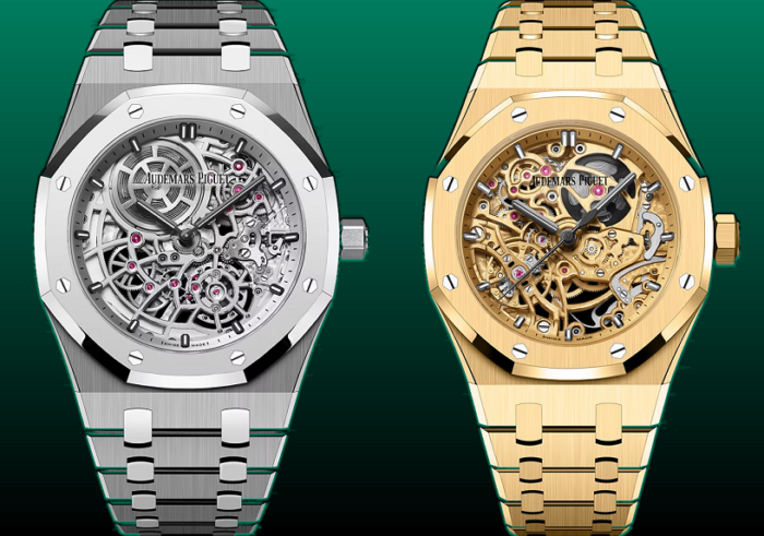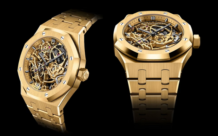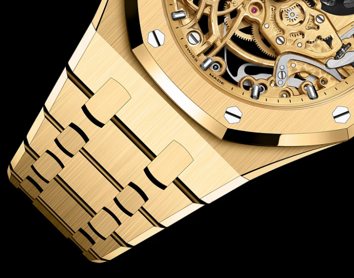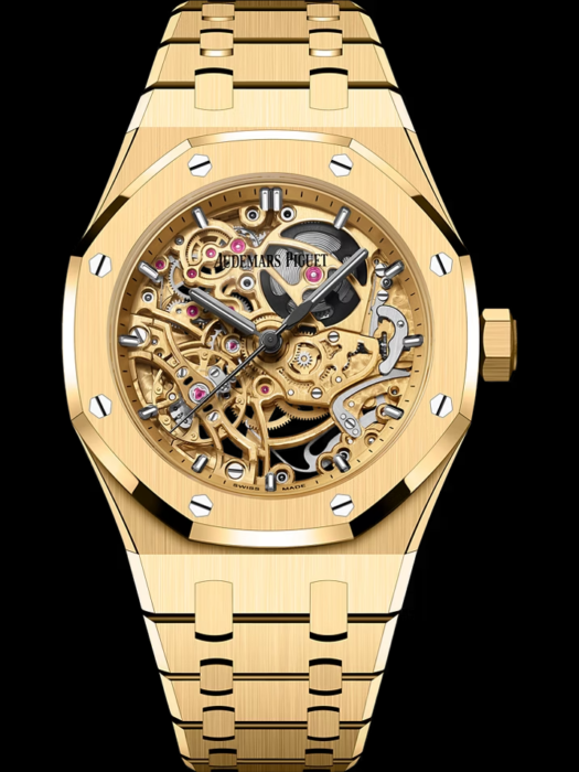 オープンワークダイヤル、蓄光加工を施した18Kホワイトゴールドのロイヤル オーク針とアワーマーカー、イエローゴールドカラーのインナーベゼル。