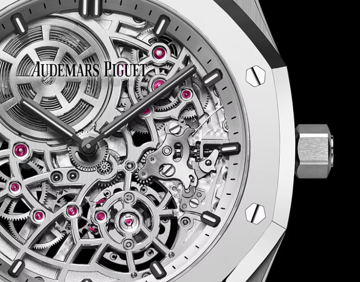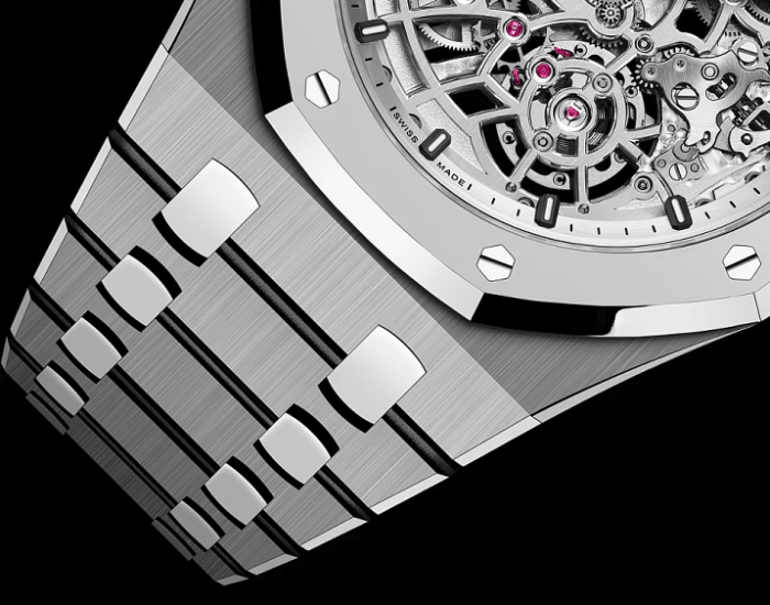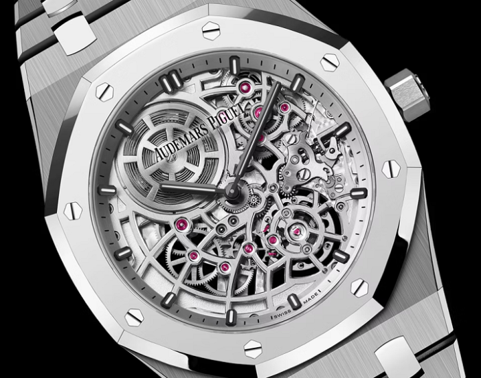 オープンワークダイヤル、蓄光加工とブラック仕上げを施した18Kホワイトゴールドのロイヤル オーク針とアワーマーカー、シルバーグレーカラーのインナーベゼル。