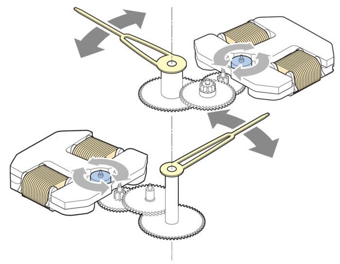 時計方向にしか動かない一般のアナログ時計とは異なりそれぞれの針を駆動する2個のモーター、そしてそのモーターの回転方向や速度を自在に操るコントロール技術によって「小さくてもきちんとした振り子の動き」を実現しました。