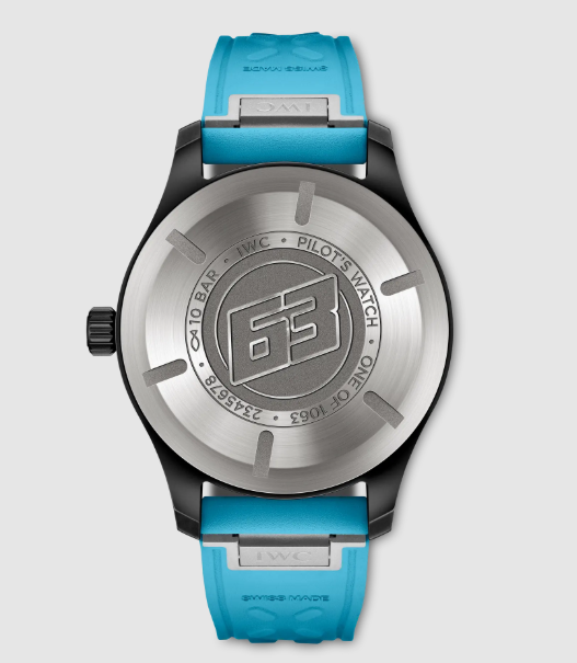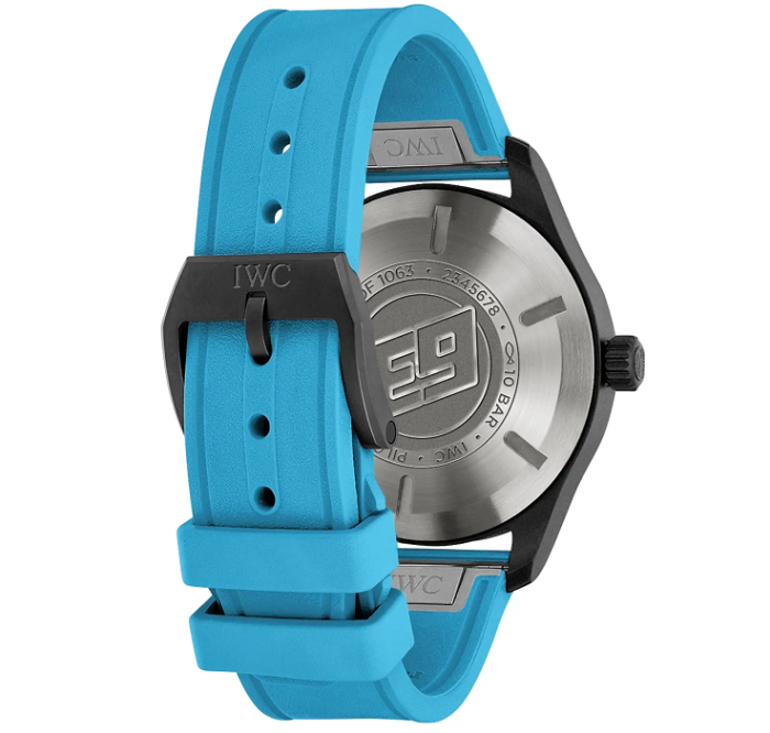 世界で1,063本限定のブラックセラミック製「パイロット・ウォッチ オートマティック 41 ”ジョージ・ラッセル”」は、ドライバーのレーシングヘルメットから着想を得たユニークなブルーの文字盤プリントとラバーストラップが特徴です。