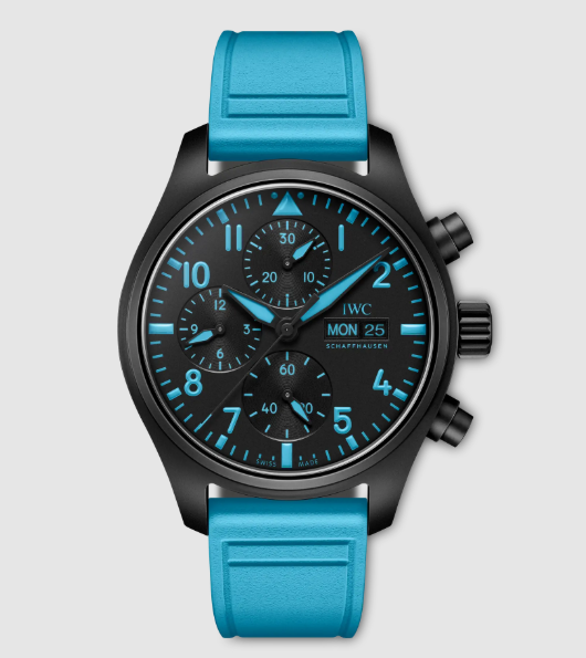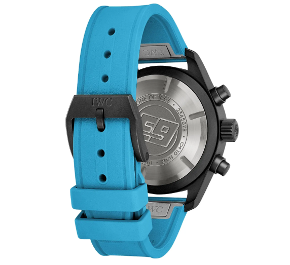 世界で1,063本限定のブラックセラミック製「パイロット・ウォッチ・クロノグラフ 41 ”ジョージ・ラッセル”」は、ドライバーのレーシングヘルメットから着想を得たユニークなブルーの文字盤プリントと、ラバーストラップを特徴としています。